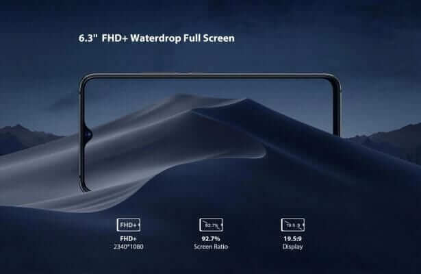 Concerning the display, it is designed with the 6.3-inch FHD+ water-drop notch display with in-cell LTPS technology. Owing to the small notch and the thin bezels, the phone maker managed to come up with an impressive 92.7% screen-body ratio.